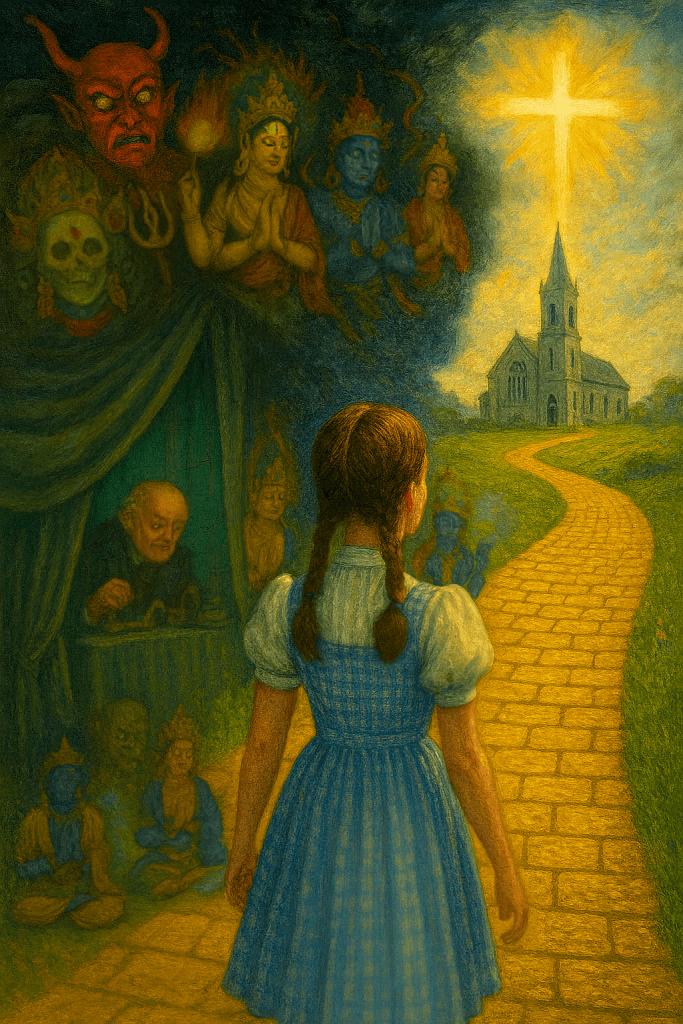 The turning point came when I least expected it. Like Dorothy traversing the Emerald City, dazzled by spectacle, I had followed the yellow brick road as far as I could, believing I was approaching a transformative experience of enlightenment. And just as Dorothy eventually reaches Oz and pulls back the curtain, only to find a small man manipulating levers, I was forced to see behind the veil as well. The Root Guru I had trusted was revealed as a sorcerer, and the tantric deities I had once exalted no longer appeared as divine guides but as accusing, demonic forces. They became something like the scary flying monkeys that viciously attack Dorothy and her friends at one point. I suddenly realized that the impressive display I had put my faith in was only smoke and mirrors, and the powers behind it were not what they claimed at all, but actually fallen angels and their human minions.