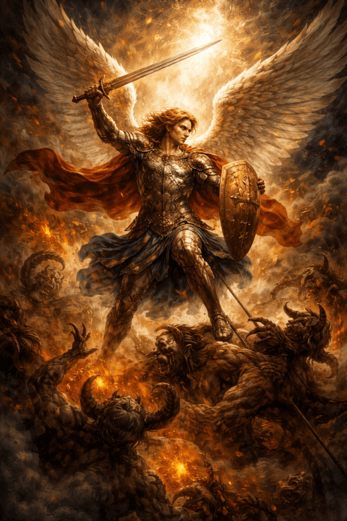 St. Michael the Archangel, defender of the faithful, stands as heaven’s warrior casting down the forces of darkness and waging relentless battle against demonic powers.